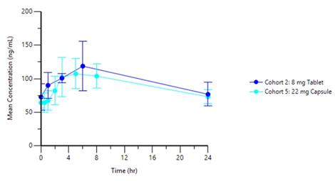 Dose normalized exposures following once daily administration of PAS-004 tablets were approximately 3-fold higher than those following administration with the capsule formulation, resulting in the 8mg tablet area under the curve (AUC) and Cmax being slightly greater than those of the 22mg capsule. The tablet formulation has demonstrated less patient variability and a similar Tmax range when compared to the capsule formulation. This is consistent with the pre-clinical evaluation of the two formulations in the dog toxicology studies.