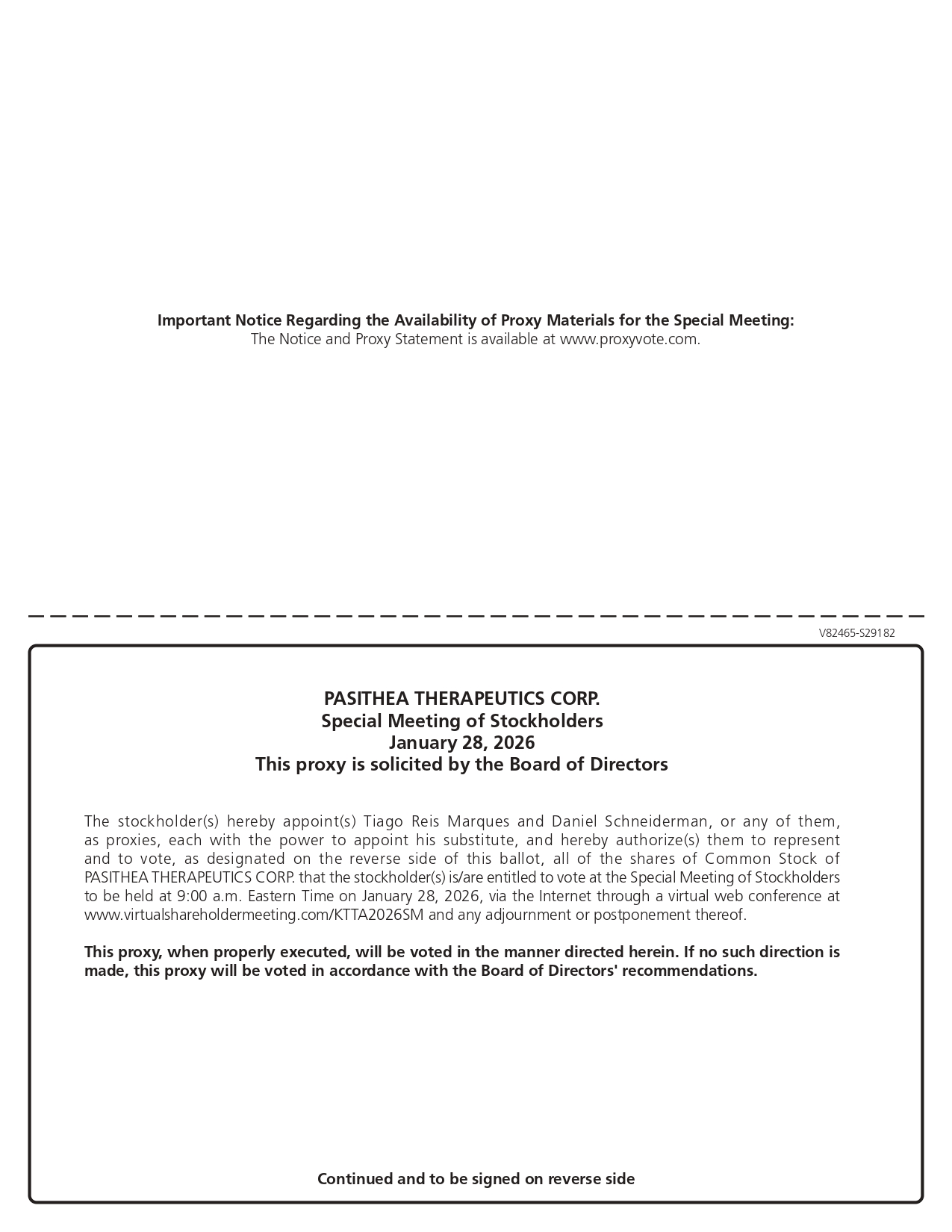 V82465 - S29182 PASITHEA THERAPEUTICS CORP. Special Meeting of Stockholders January 28, 2026 This proxy is solicited by the Board of Directors The stockholder(s) hereby appoint(s) Tiago Reis Marques and Daniel Schneiderman, or any of them, as proxies, each with the power to appoint his substitute, and hereby authorize(s) them to represent and to vote, as designated on the reverse side of this ballot, all of the shares of Common Stock of PASITHEA THERAPEUTICS CORP . that the stockholder(s) is/are entitled to vote at the Special Meeting of Stockholders to be held at 9 : 00 a . m . Eastern Time on January 28 , 2026 , via the Internet through a virtual web conference at www . virtualshareholdermeeting . com/KTTA 2026 SM and any adjournment or postponement thereof . This proxy, when properly executed, will be voted in the manner directed herein . If no such direction is made, this proxy will be voted in accordance with the Board of Directors' recommendations . Continued and to be signed on reverse side Important Notice Regarding the Availability of Proxy Materials for the Special Meeting: The Notice and Proxy Statement is available at www.proxyvote.com.